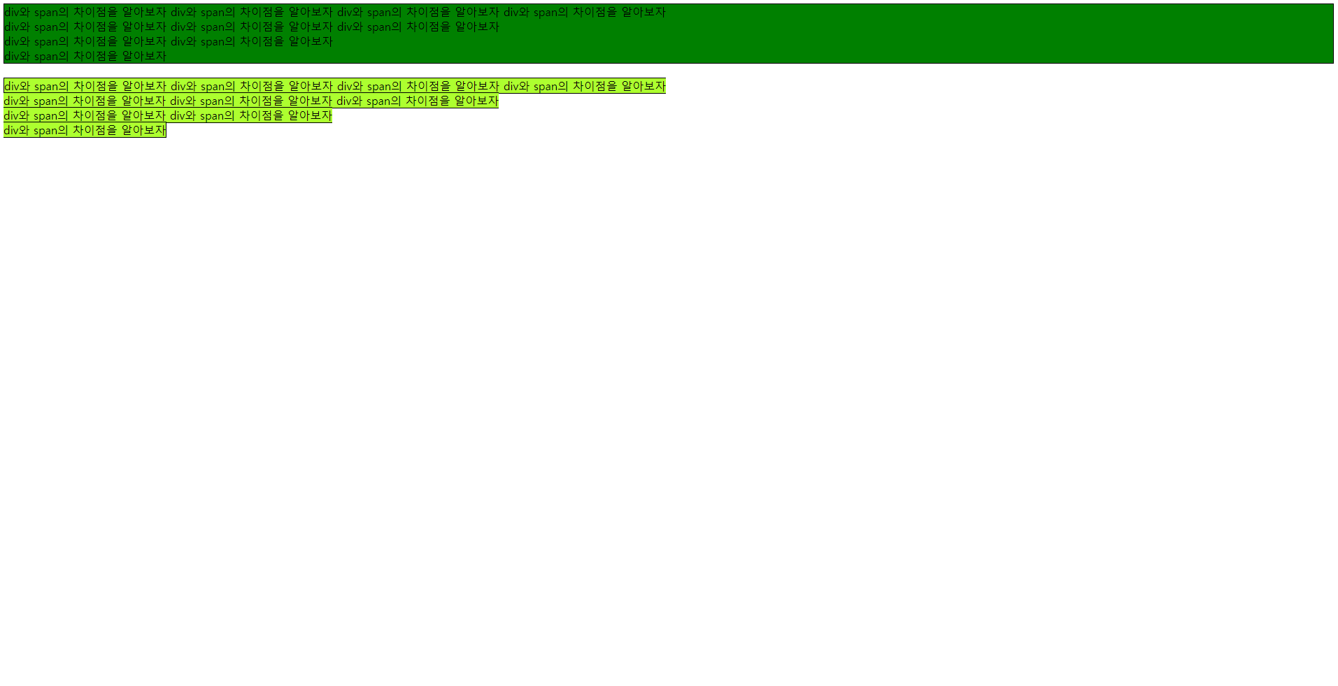 - span은 줄단위로 영역을 감싸게 되며 범위가 다르다.